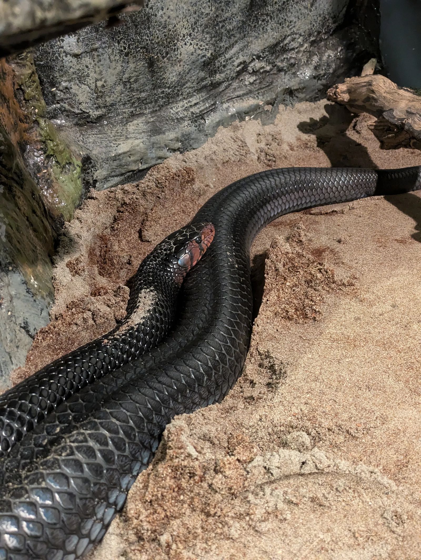 Eastern indigos snakes are native to southwest Florida, including islands like Sanibel and Captiva. This species is commonly mistaken for other snakes, but what helps these snakes stand out is that their body coloration is a shiny or iridescent black or bluish with red or cream markings around their nose and chin. Eastern indigos are also significantly longer than other American species and can reach anywhere from five to seven feet long with some even reaching up to nine feet long. Unlike other popular snakes that are classified as constrictors (snakes that wrap around and squeeze their prey) or venomous (bite their prey and inject venom into them), eastern indigos are considered thrashers and will chase down their prey and once they catch them they will whip their head back and forth with their food in their mouth (similar to how puppies play with new toys).
